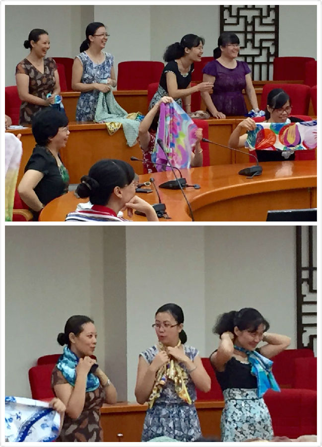 9月24日下午,学校工会女教职工委员会请来丝绸文化公司的高级认证讲师,为女教职工讲授如何系好丝巾。讲师从真丝的辨别、保养洗涤、丝巾和脸型的搭配要领等做了详细的讲解,并现场演示了燕尾宫廷结、领带结、风情结、蝴蝶结、玫瑰花结等十几种不同的丝巾系法。女教职工们边听边实践、互当模特,相互拍照,其乐融融。小小丝巾彰显了女性之优雅、自信和风度,深受女教职工喜爱。