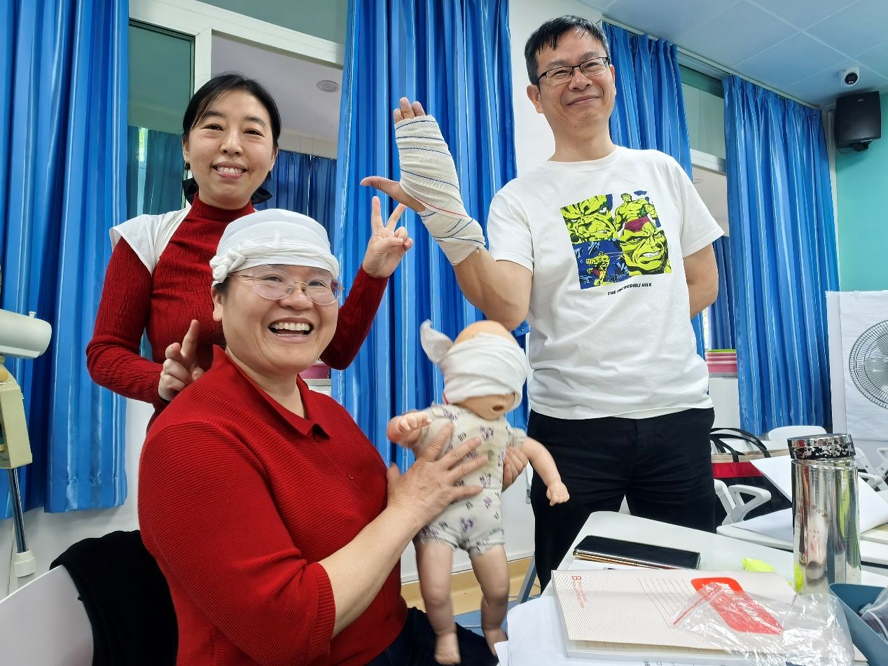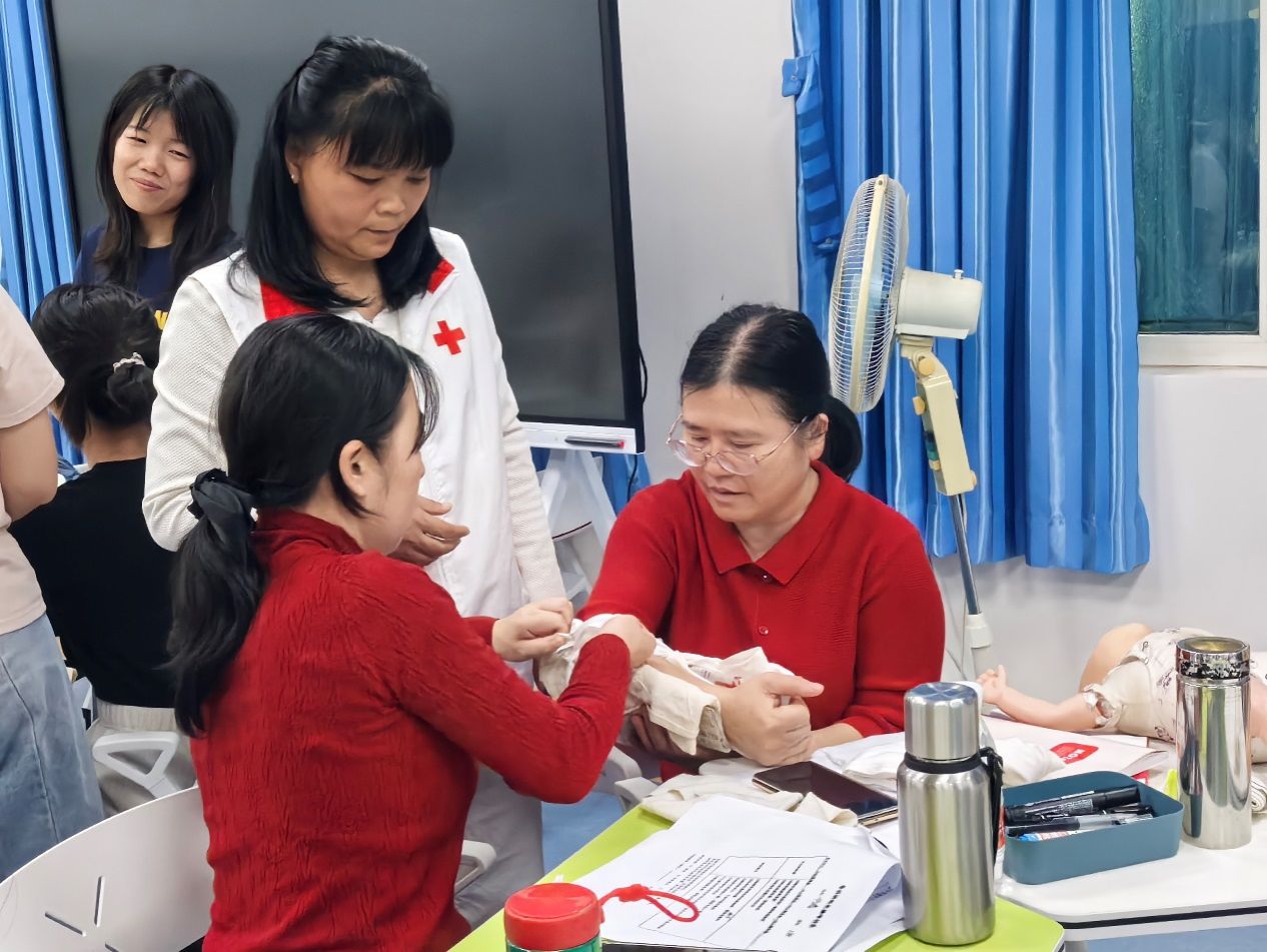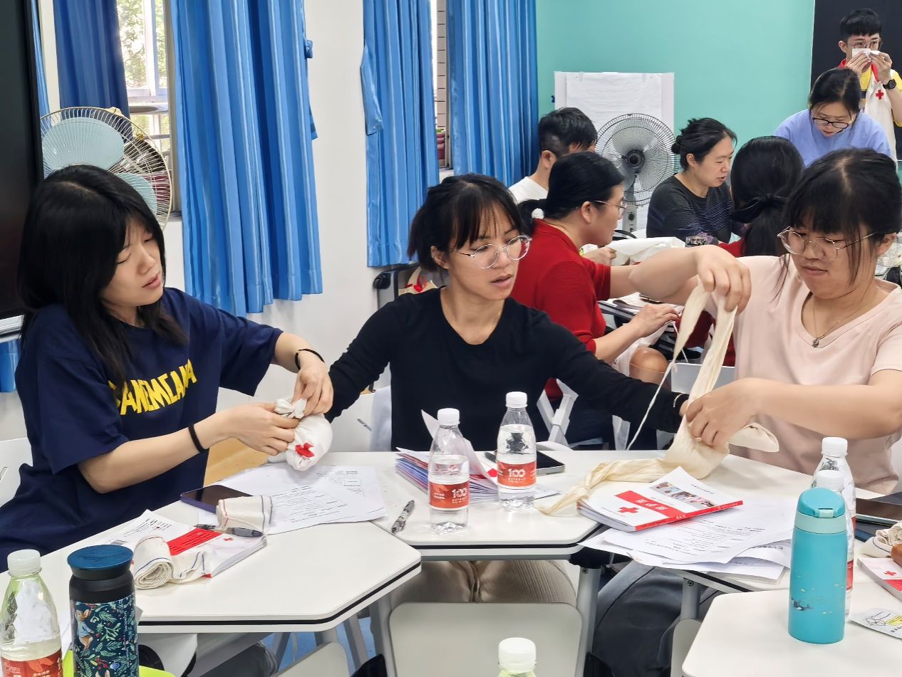 本次培训由广州市健安应急救护培训中心承办,课程内容涵盖红十字运动基本知识、心肺复苏(CPR)、自动体外除颤器(AED)使用、创伤救护技术、常见急症与意外伤害处理等核心模块。培训采用“理论讲授+沉浸式情景模拟+分组实操练习”的多元化教学模式,确保学员在16学时的学习中掌握扎实的急救技能。在“心肺复苏”单元,讲师通过模拟真实急救场景,指导学员分步骤练习成人、儿童及婴儿的CPR操作,并强调“高质量心肺复苏”的关键标准;创伤救护环节中,学员们亲身体验止血、包扎、骨折固定等技能,通过反复实操提升应急反应能力。此外,选修课程结合学员需求,灵活增设烧烫伤处置、气道异物梗阻急救等内容,进一步拓展了培训的实用性与覆盖面。